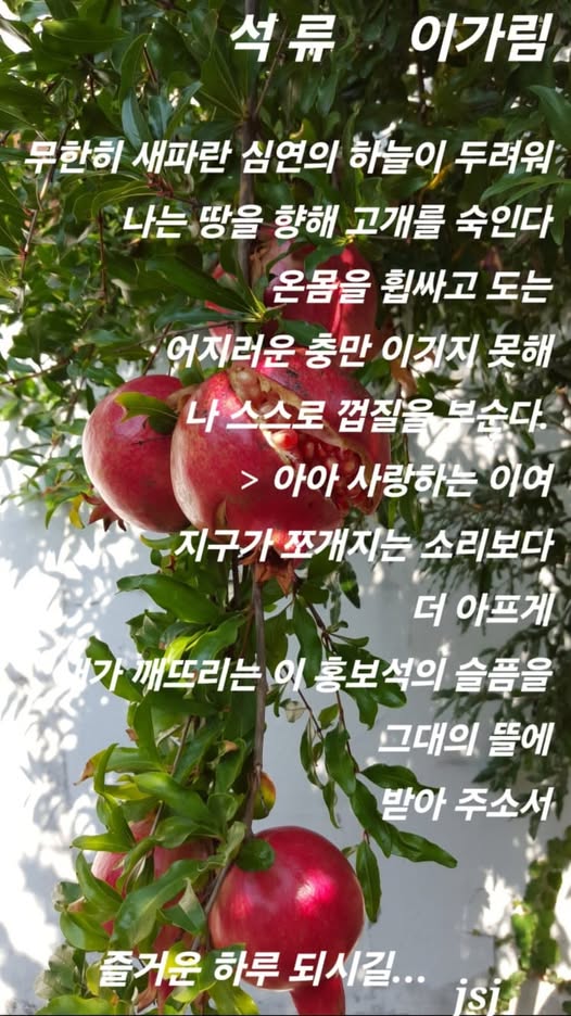 추억은 아름다운 것. 30년 동안 가을이면 탐스런 열매로 오가는 이의 시선을 끌던 대문 앞의 석류가 갈무리를 잘 못하여 2017년 겨울 추위로 동사하였다. 내가 없어진 석류를 못내 아쉬워하니 친구(JSJ)가 사진 위에 시(詩)를 담아 보내왔다..